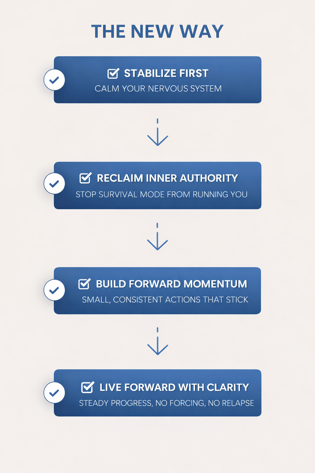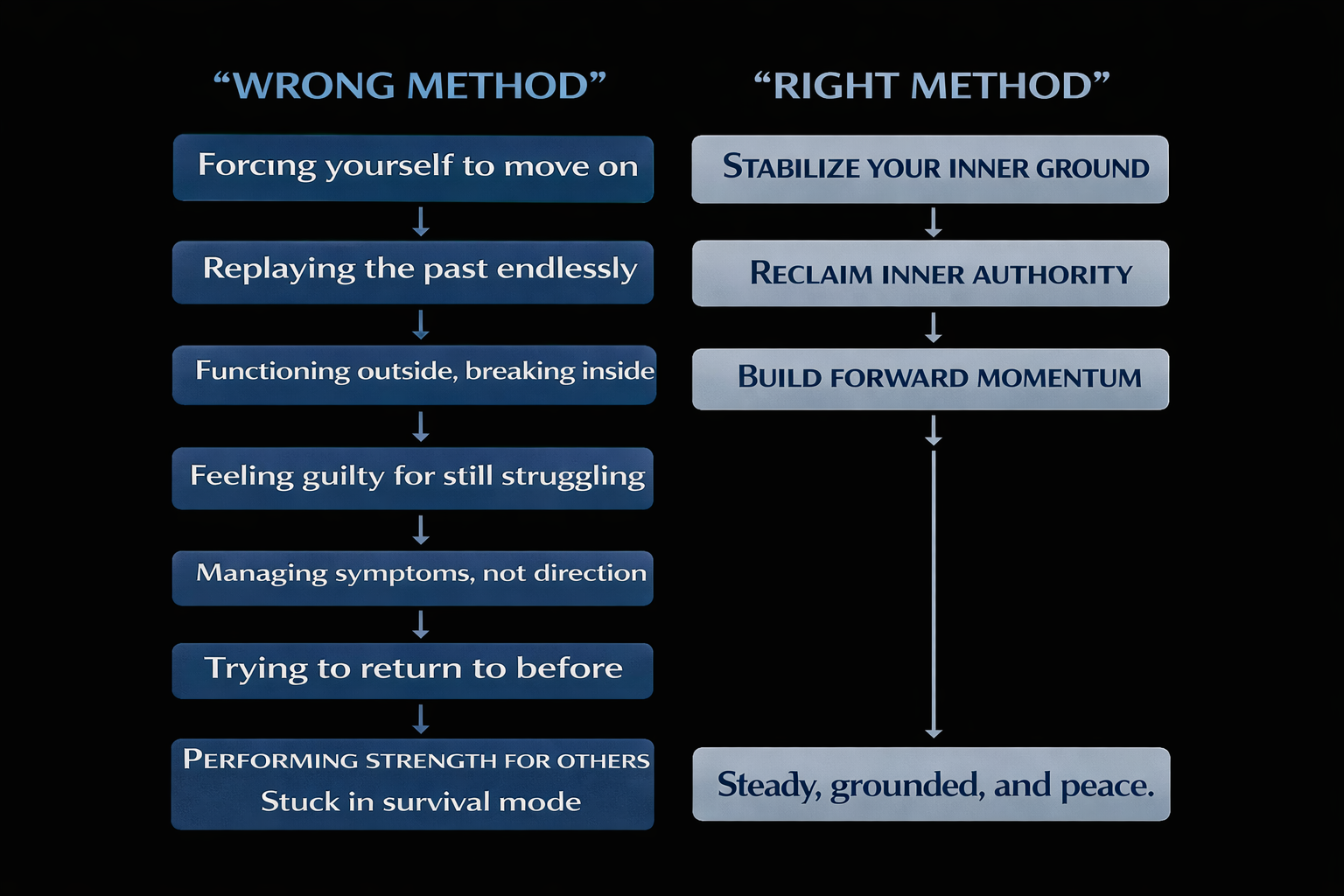 The way we do this is STABILIZE FIRST (so survival mode stops running the show); RECLAIM INNER AUTHORITY(so your thoughts and reactions don't hijack you); and BUILD STEADY FORWARD MOMENTUM (without forcing healing or reliving the past).