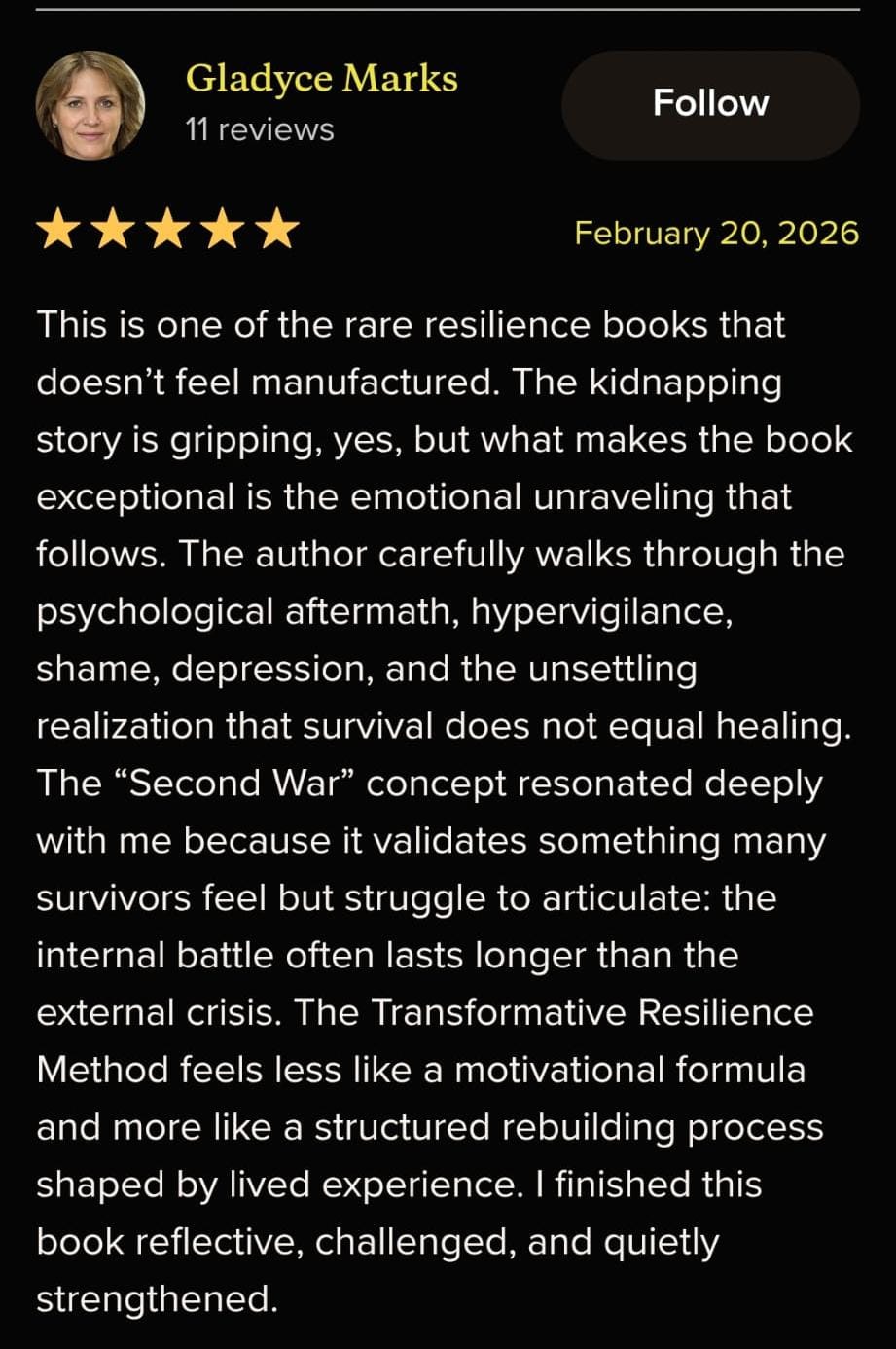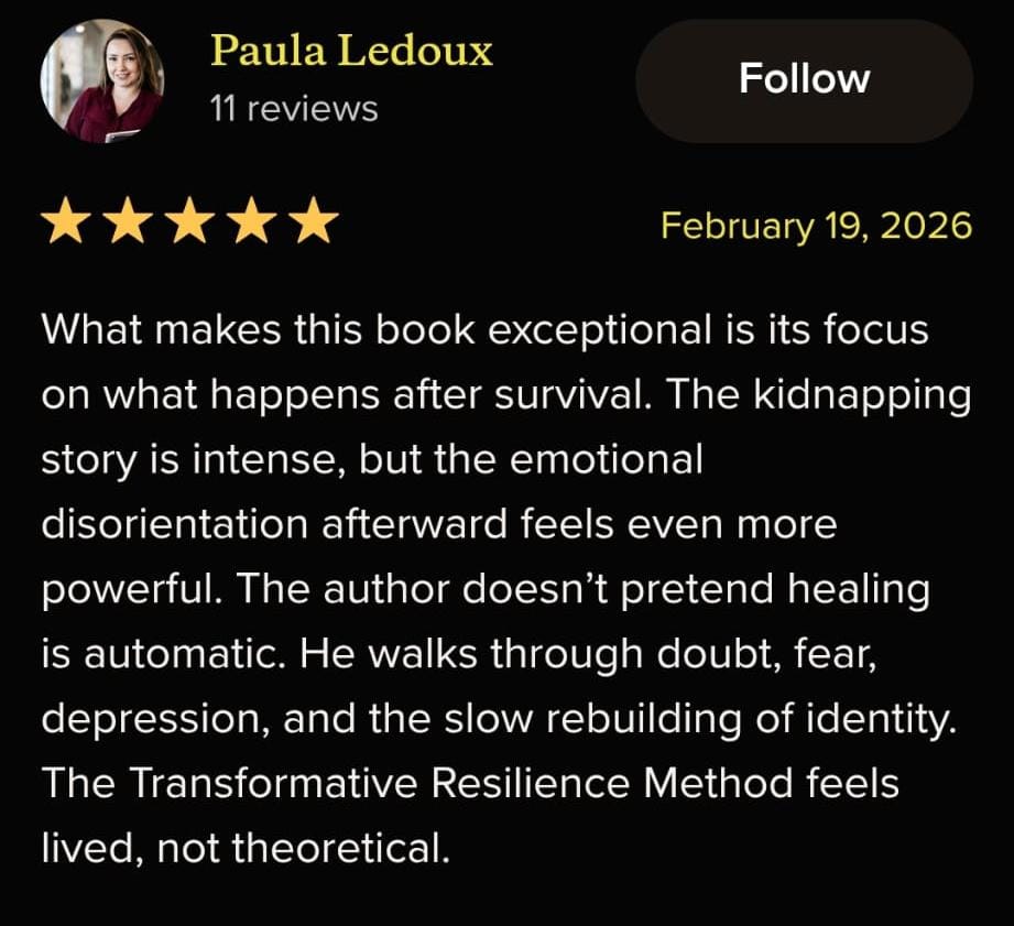 And now, you have the opportunity to duplicate the entire The Transformative Resilience Methodology (TRM) I used to rebuild my life after the kidnapping and to triumph over the darkness that followed the captivity.